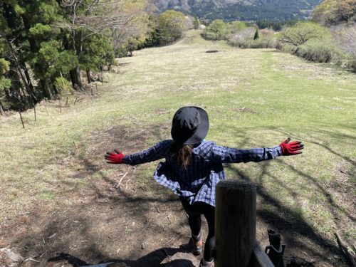 山頂近くは高い木がなくなり、絶景が待っています。高森町を一望。