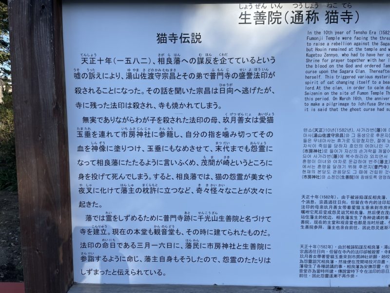 そこで相良藩では祟りの恐ろしさから逃れるため、玖月善女親子、愛猫玉垂の霊を鎮めるため、普門寺跡に新しく生善院を建て、寛永2年(1625年)には別に観音堂を建て、法印の影仏として阿弥陀如来を、母の影仏として千手観音像を祀り、藩民には毎年3月16日には、15日の市房山神宮参詣(さんけい)とともに猫寺参詣を行うよう命じ、藩主自らもこれを実行したため、ようやく霊も静まったそうです。(水上村HPより抜粋)