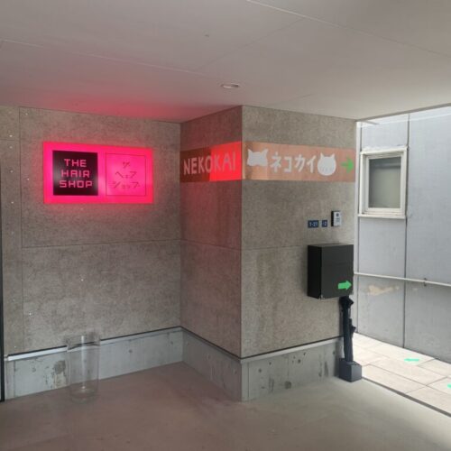1階は美容院「THE HEAR SHOP(ザ ヘア ショップ)」さん、2階が猫カフェ「NEKOKAI(ネコカイ)」のようです。
