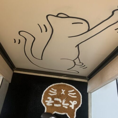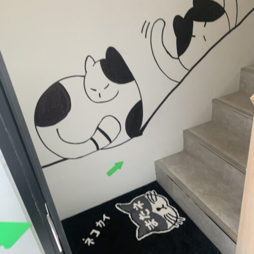 入口からしてオシャレですね…!壁に描かれる元気なネコチャン達を見ながら二階に上がります。わくわく。