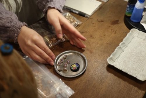 こちらのチェコガラスの好きなボタンを選んでお店で作ってもらえます。込み具合にもよりますが、お時間は3日~1週間程度。指輪、ピアス、イヤリング、お好きなものをお好きなパーツで。