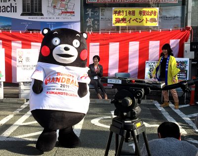 もう気候も寒いので…くまモンは「2019女子ハンドボール世界選手権大会」応援Tシャツを着ての参加です。