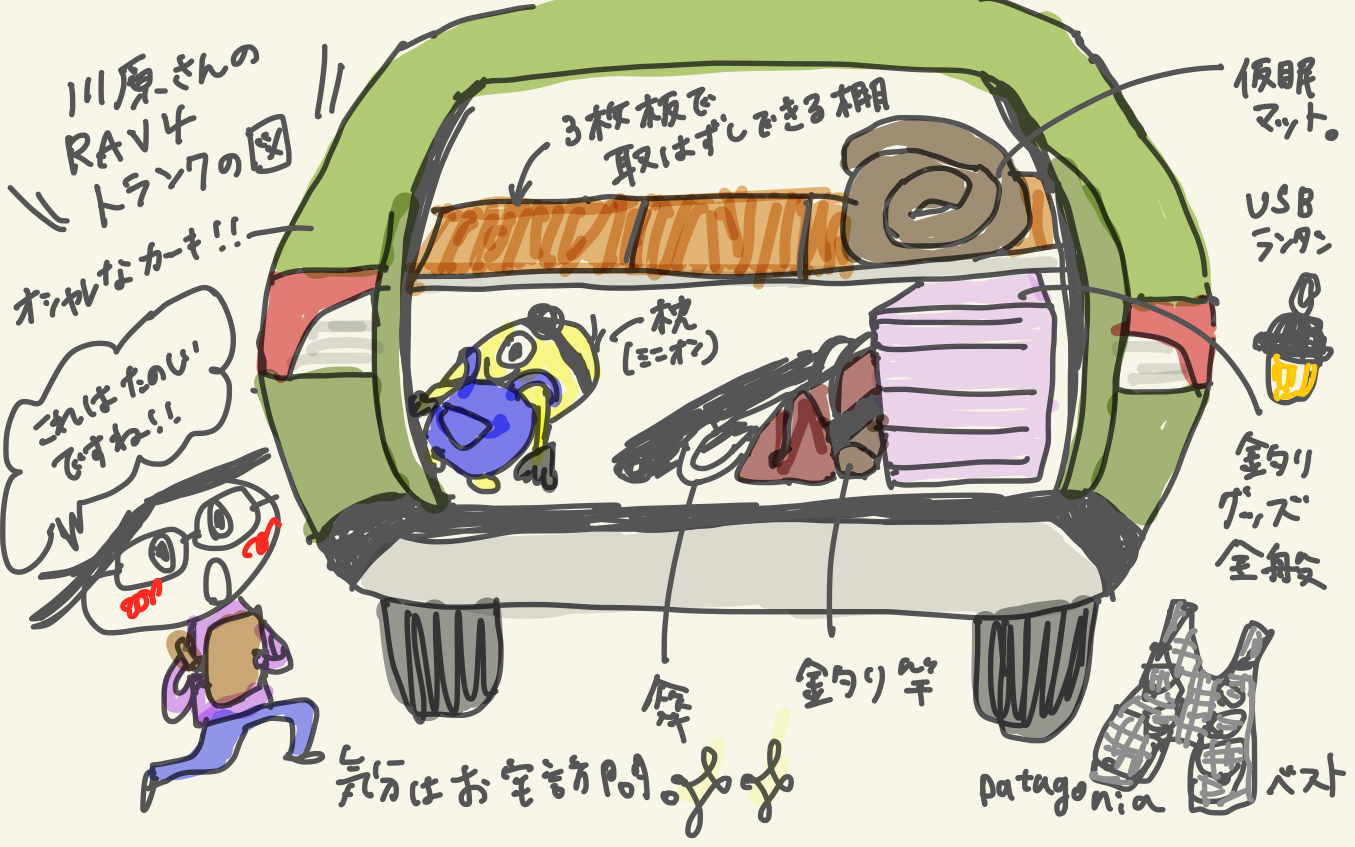 しかも、わずか2週間前に届いたばかりの新車に自ら手を加え、トランクには自作の棚が設置済み (この棚板、3枚に別れていて、屋外でテーブルとしても使えるようになってました)。