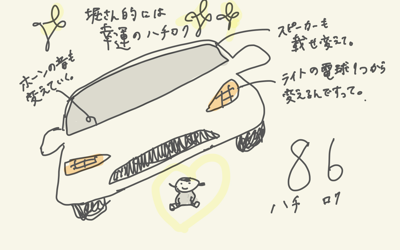 堀さんハチロクの後部座席は、体操座りしないといけないくらい狭いし、チャイルドシートの乗り降りの際は、低すぎる天井で髪を擦りがちな娘は近い将来ハゲるんじゃないかと心配になるほどですが、僕ら家族にとってはラッキーなクルマなのでこの調子で乗り続けます!