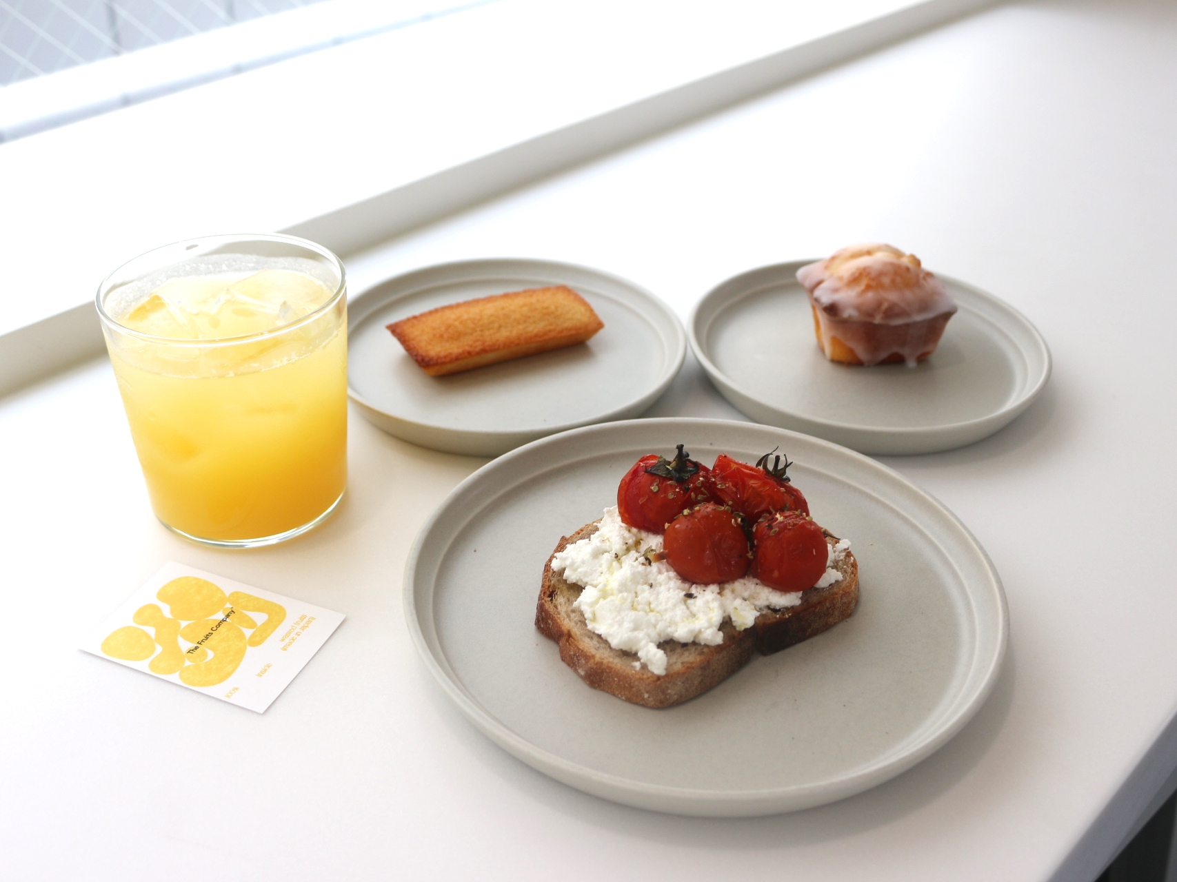 フルーツジュース晩柑(660円)/トマト&チーズのブルスケッタ(495円)/焼き立てフィナンシェ(319円)/レモンケーキ(385円)
