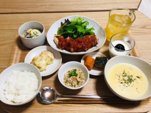 メインのチキンはカリっとこんがり香ばしく、トマトソースでさっぱりいただけます。