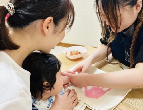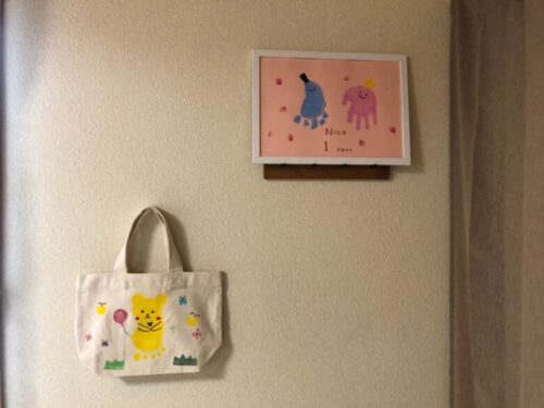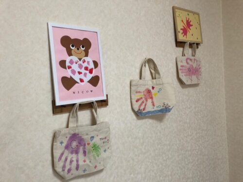 やってみたのは白い布バックをキャンバスに手形をスタンプしていく手形アート。親子で楽しむことができます。