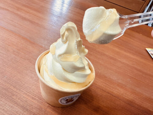 真っ白なソフトクリームに黄色いマキシト(晩白柚のペースト)がかかっています。