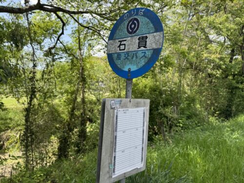 雨風で汚れた石貫(いしぬき)バス停。