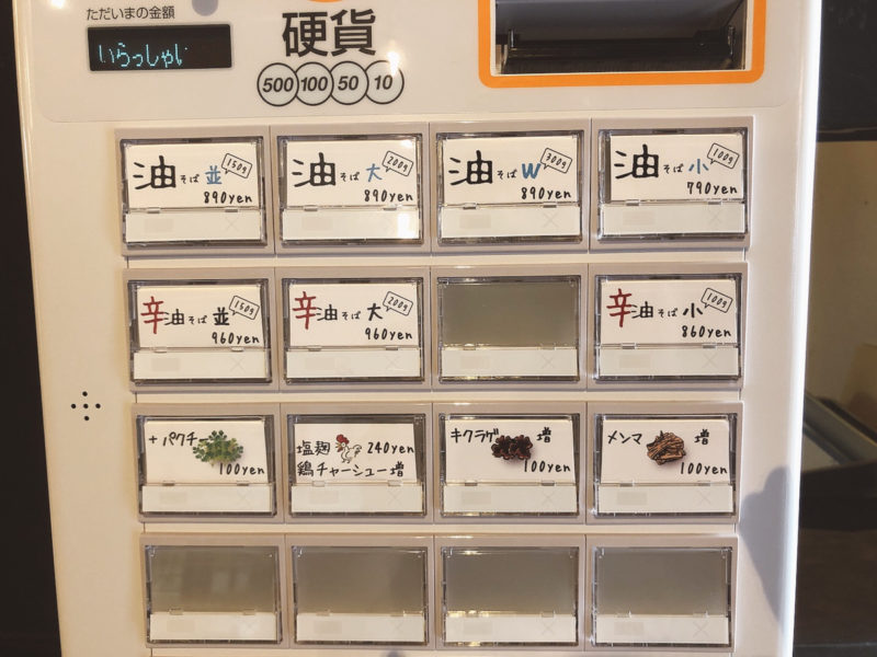 メニューは、券売機システムで油そば、辛油そば、餃子等があります。どれも気になりますが、塩麴鶏チャーシュー。これは気になりすぎる。