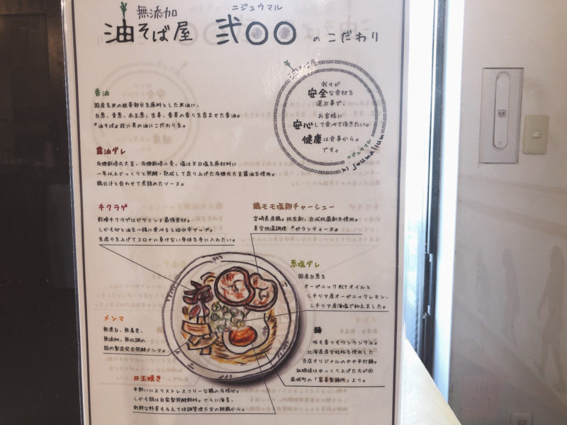 看板メニューの油そばは、素材にこだわりまくっているそうで、入っているすべての食材にそれぞれこだわりがあるそう。