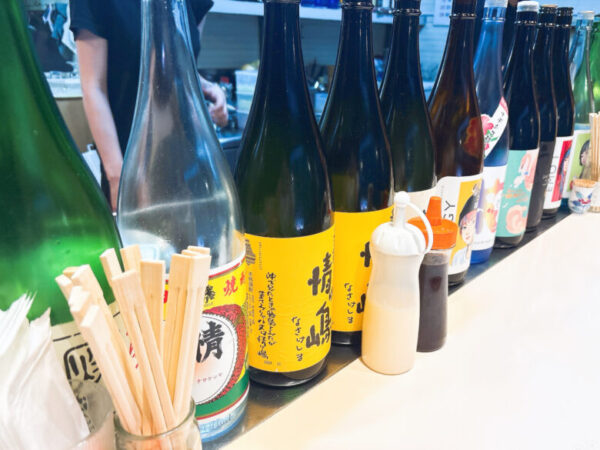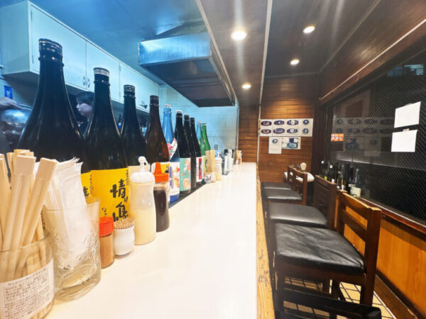 カウンターにはずらーっと焼酎が並び、夜は酒場と化します。