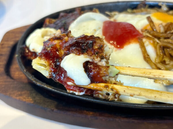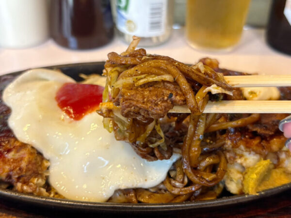 焼きそばとお好み焼きの上に目玉焼きが乗ったボリューミーなメニュー。