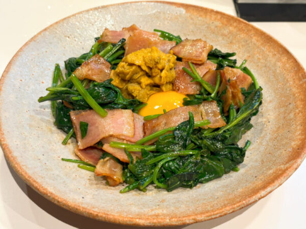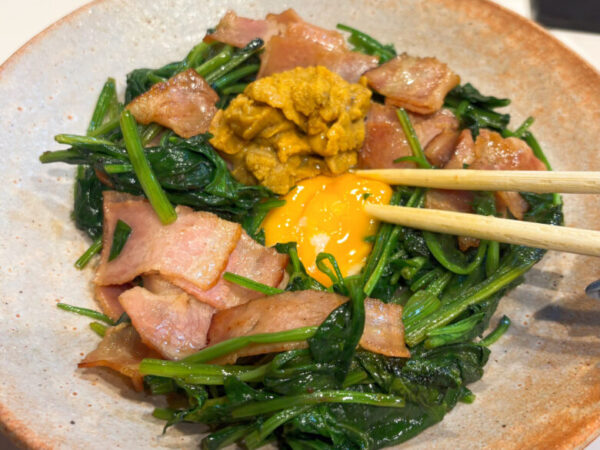 全体的にはあっさりとした味付け。そこにベーコンの塩味とウニのコクが混ざると…美味すぎる〜!