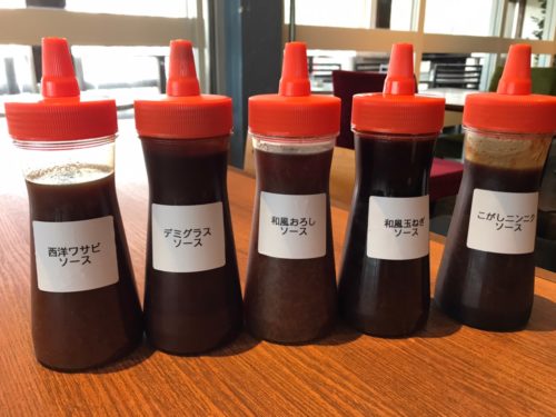 こだわりのソースは5種類あり、いろんな世代の人が楽しめるような品揃えになっているので、自分好みの味でハンバーグを食すことができます。