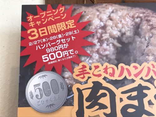 2月24日に閉店した、にじのもりの「夜カフェ⑥」のあとに、2月27日に「手こねハンバーグ 肉まる」がオープン!子どもから大人まで、みんな大好きな手作りのハンバーグを、ゆっくりと味わえるお店です。オープンから3日間は、利益度外視のオープニングキャンペーンもあるので、見逃せません!