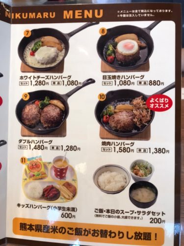 キッズメニューも用意されています。農家さんから直接仕入れられているという、熊本県産のお米は食べ放題!そのほか、一品料理やデザート、アルコールやソフトドリンクなどもあります。