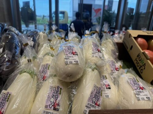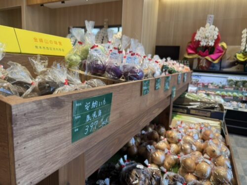 入口、正面に鎮座しているのは新鮮な野菜たち。