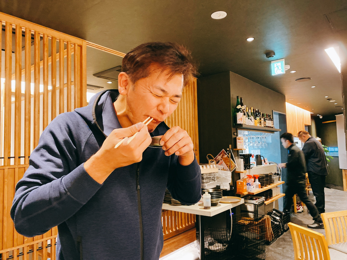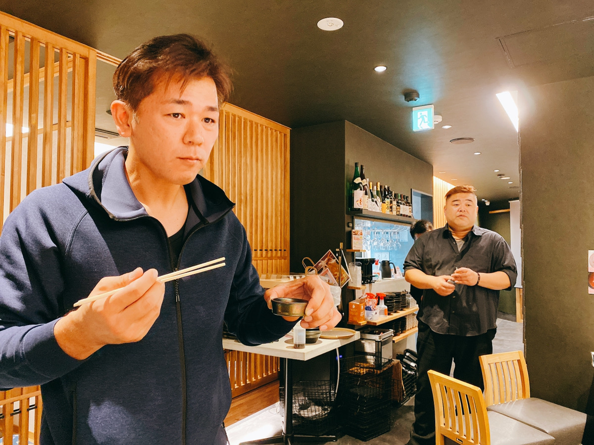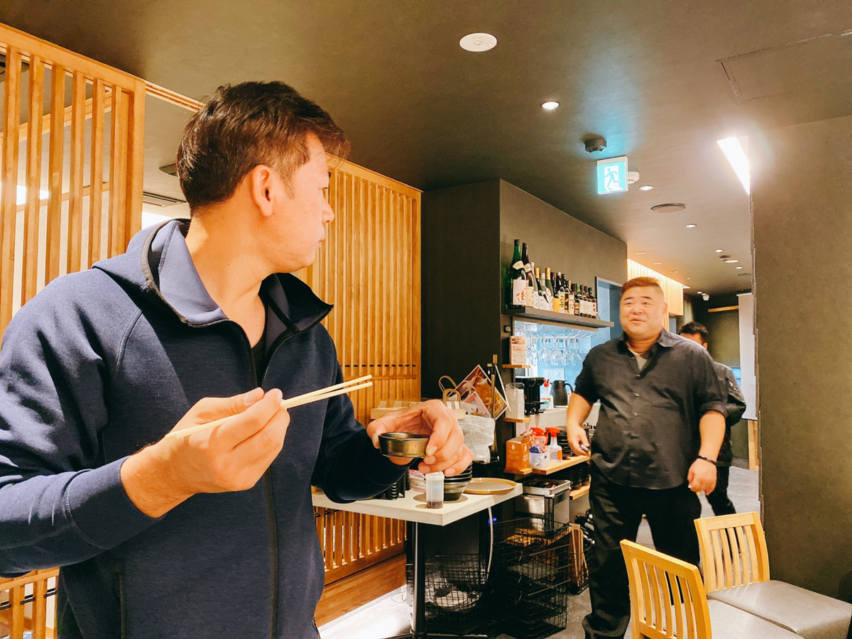 ふと後ろをみたら、自家製ポン酢もってめっちゃ待機してる安武オーナー。
