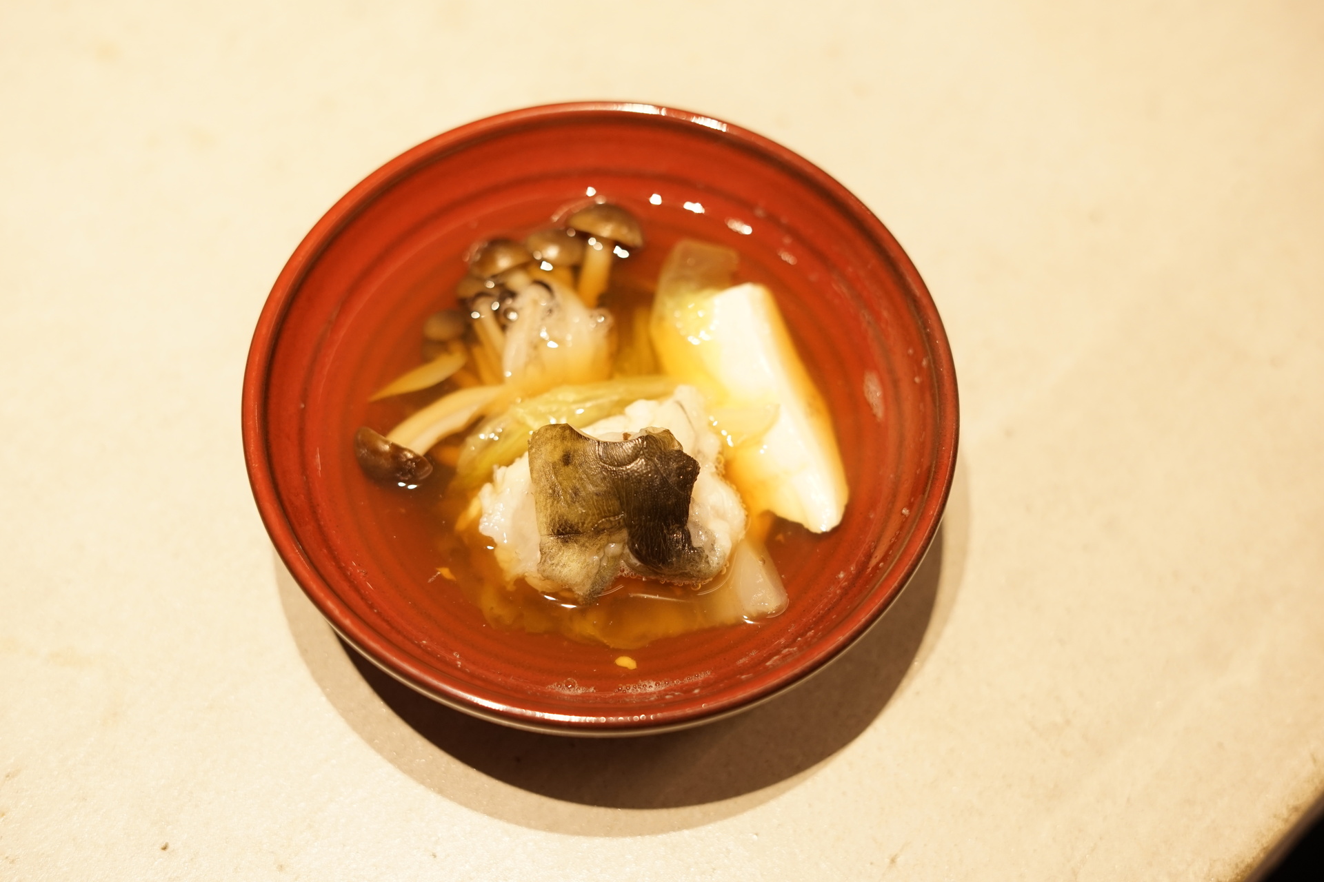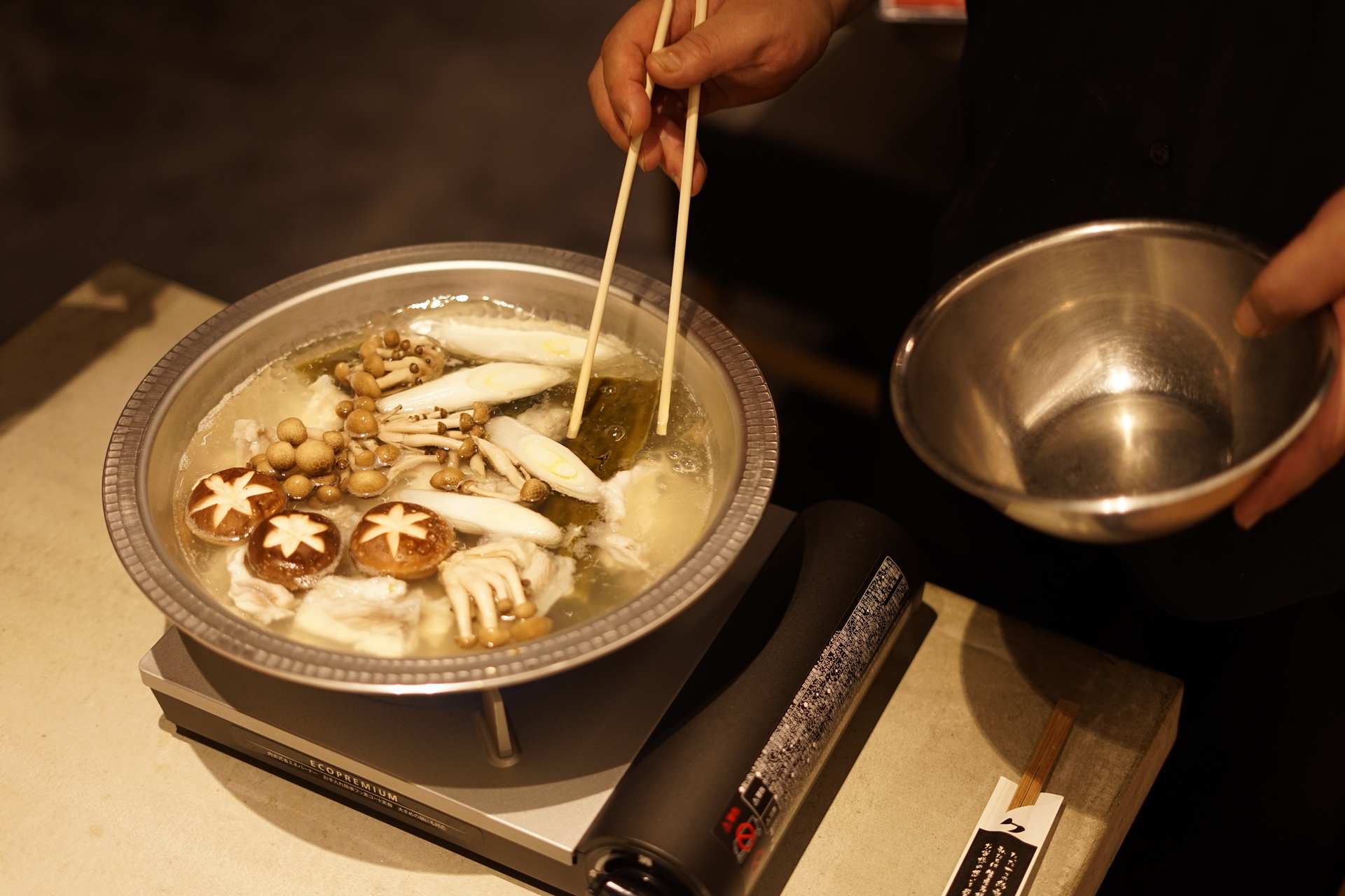 昆布出汁の旨味、そしてとらふぐのアラの旨味。これらが自然と混ざりあっていく中で、火が通りにくいネギやキノコ類を投入します。昆布とはここでさよなら。