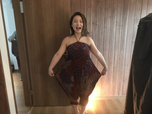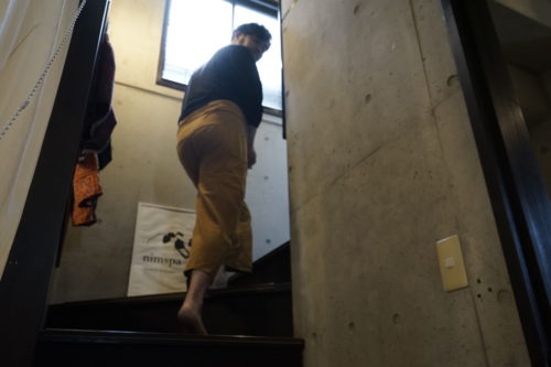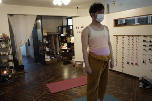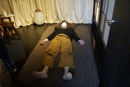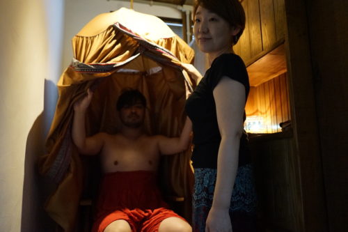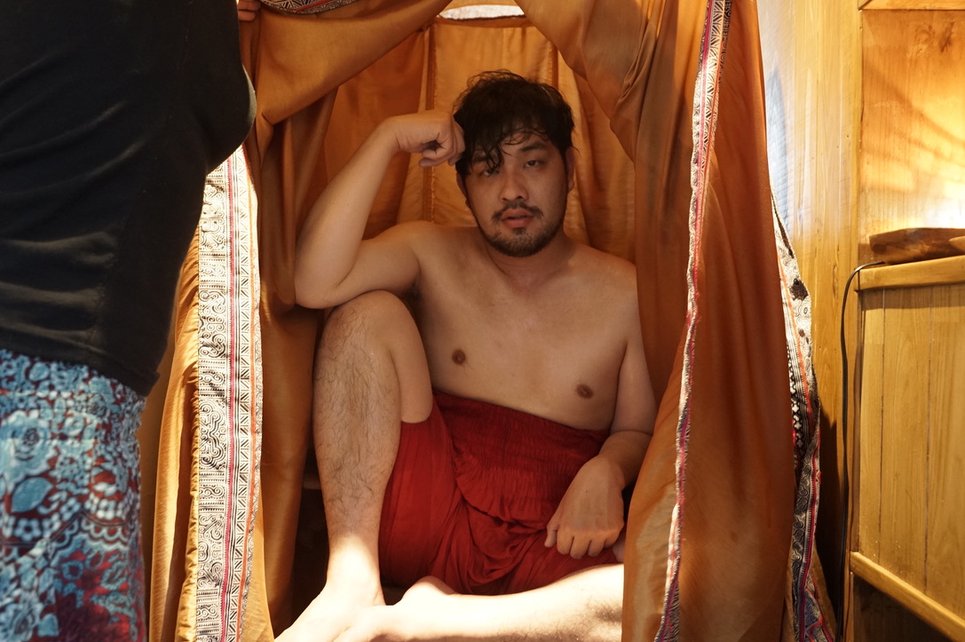タイパンツに着替えた山田が、初ハーブサウナ体験です。