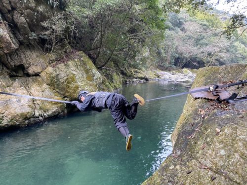 忍者体験は年中体験出来ますが、水遁の術(キャニオニング)は本来であれば4/25から10/11まで。川のお勉強をしながら滝修行や水を使った攻撃術や防御術などしっかり忍者修行が出来ちゃいます。