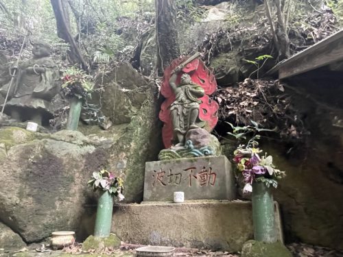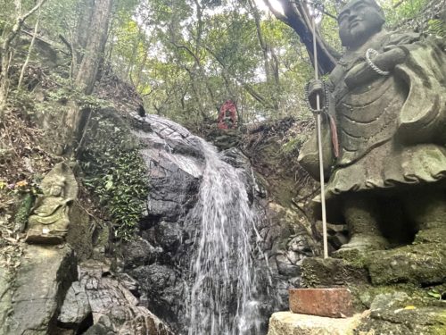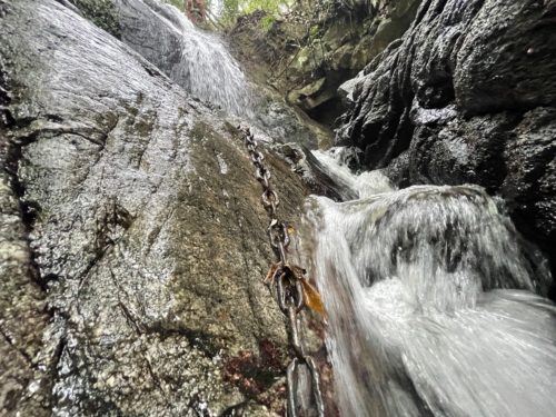 中腹に座れるスペースがあるので、この鎖を握ってそこにたどり着き修行をする方もいらっしゃるそうです。