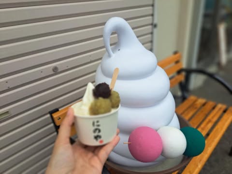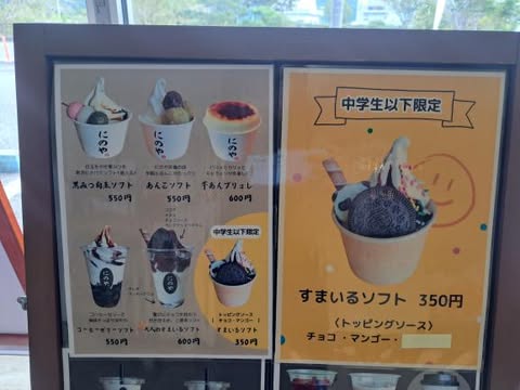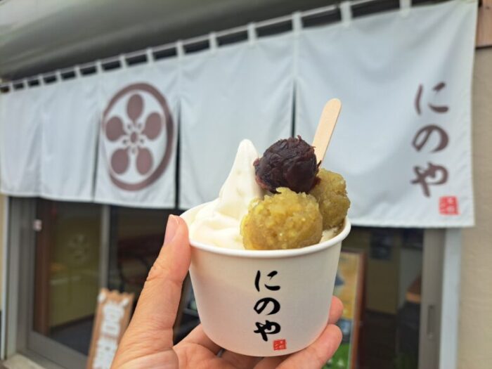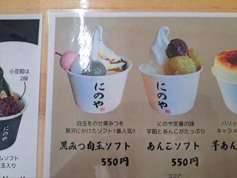 にのや本舗では温かい「いきなり団子」以外にも、冷たいソフトクリームや飲み物も販売しています。