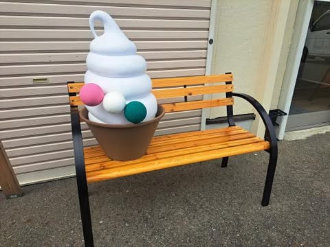 外にベンチがあるので大きなソフトクリームの横でいただきます。