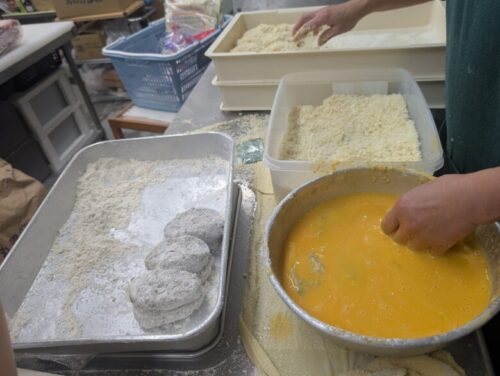 スタッフの手で一つひとつ丁寧に、生パン粉をまとわせて作られる「にらメンコ。」。