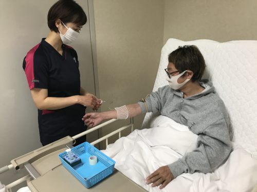 採血は、点滴のような管を通して、時間になったらそこから採血します。つまり、何回も刺されないです。