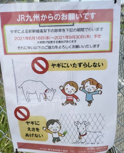 「西熊本駅にはヤギが4頭います。高架下を除草する際の作業員の熱中症や事故防止のため、ヤギを放して除草作業を行っています。レンタルしているヤギで、柵と屋根と休憩小屋があるといいそうなので、高架下は柵と屋根(高架)があり日差しが遮ることができ、小屋を設置するだけで餌の必要もないため、試験的に飼育しています。名前は特に聞いていません。」