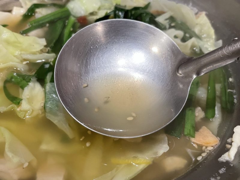 ダシだけ持って帰りたいというお客さんもたくさんいるそうです。野菜がしなって食べ頃になると、もつや野菜のエキスがこのダシに染み込んで、絶妙な味になります。