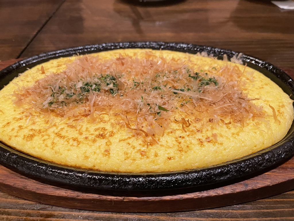 この黄色いドームは、山芋ステーキ。丸みが芸術的。ポン酢をかけると、ジョワ〜って鉄板がなるんです。創業当時からの人気メニュー!!