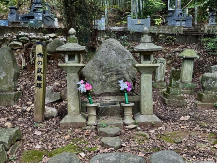 この塚は、城下の西郊にあるところから、西の武蔵塚と呼ばれ、武蔵の高弟寺尾家の墓域である。死の直前の武蔵が寺尾求馬助に「兵法三十五箇条」を、その兄孫之丞に「五輪書」を授けて二天一流の正系を伝えたところから、愛弟子の墓域に葬られたという説も生まれてきたのだろう。武蔵は兵法の達人であるとともに、すぐれた芸術家で、その枯淡たる風韻のある書画彫刻にその人格が偲ばれる。