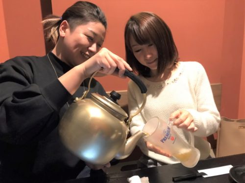 店主の中村信保さんにお伺いすると、ビールを注ぐときは、できるだけ細く注ぐ方が、泡が立たずにうまく注げるとのこと。試しにやかんでビールを注いでみたら、うまくいったので商品化したそうです。このやかんビールなら、グラスを泡でいっぱいにする心配もありません。