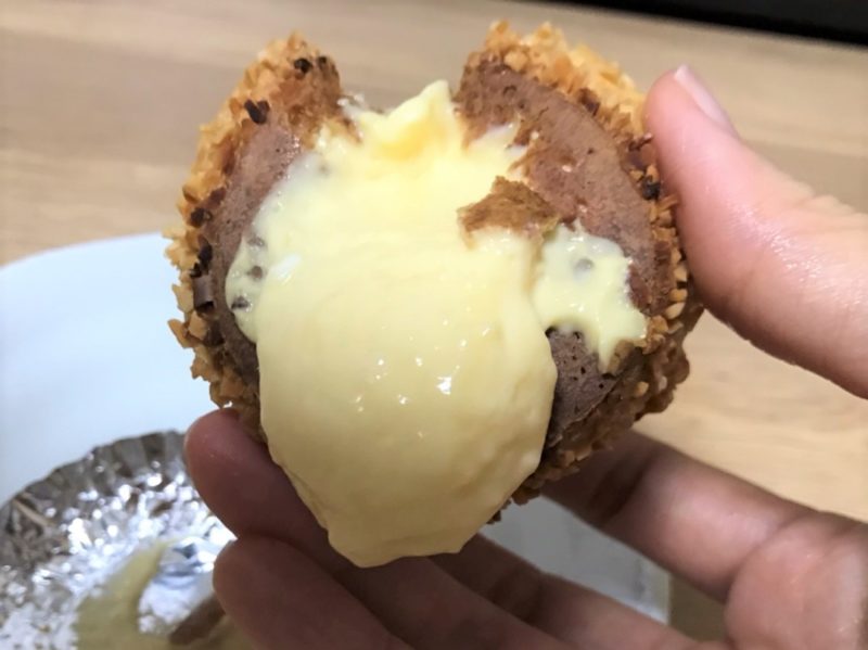 シュークリームをアルミからはがした時点で、もう底からこんなにクリームが…!