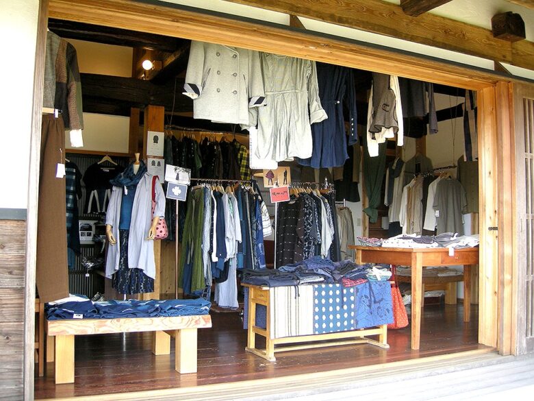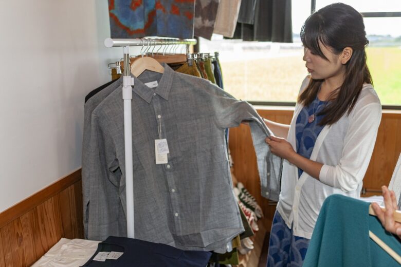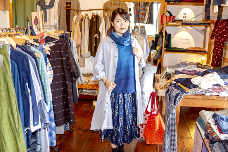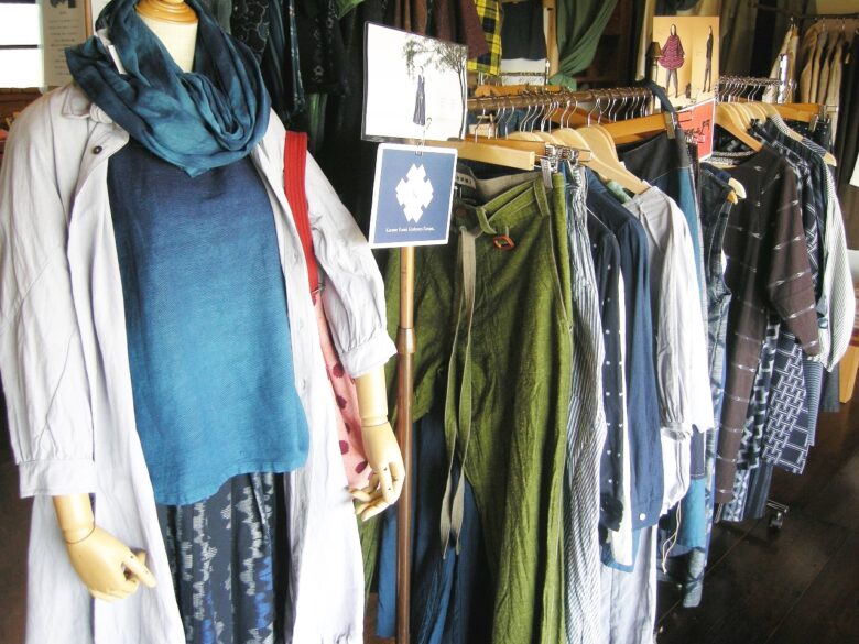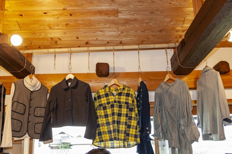 縁側の外からみてもわかるくらい、店内には素敵な洋服がたくさん!これすべて天然素材を使った洋服なんだそうです。
