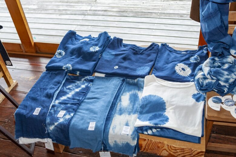 それは、藍染の生地なんです。染料に漬けて、絞って広げて、また漬けて…これを何度も何度も繰り返して、その色が出てるんですよ。