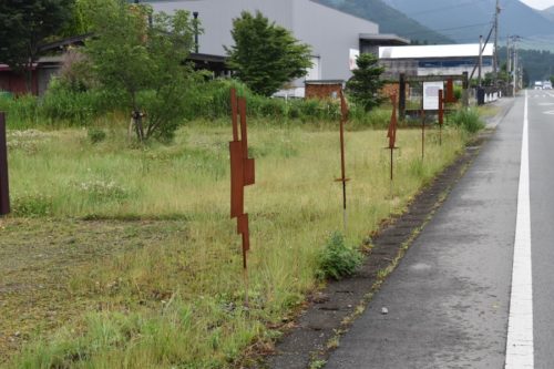 道路沿いに何か棒状のものが地面に刺さっています。