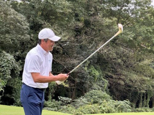 「5回なんて大したことないですよ!よし!じゃ先生にはハンデを与えます。伝説の木製ドライバー、パーシモンを使用してください」
