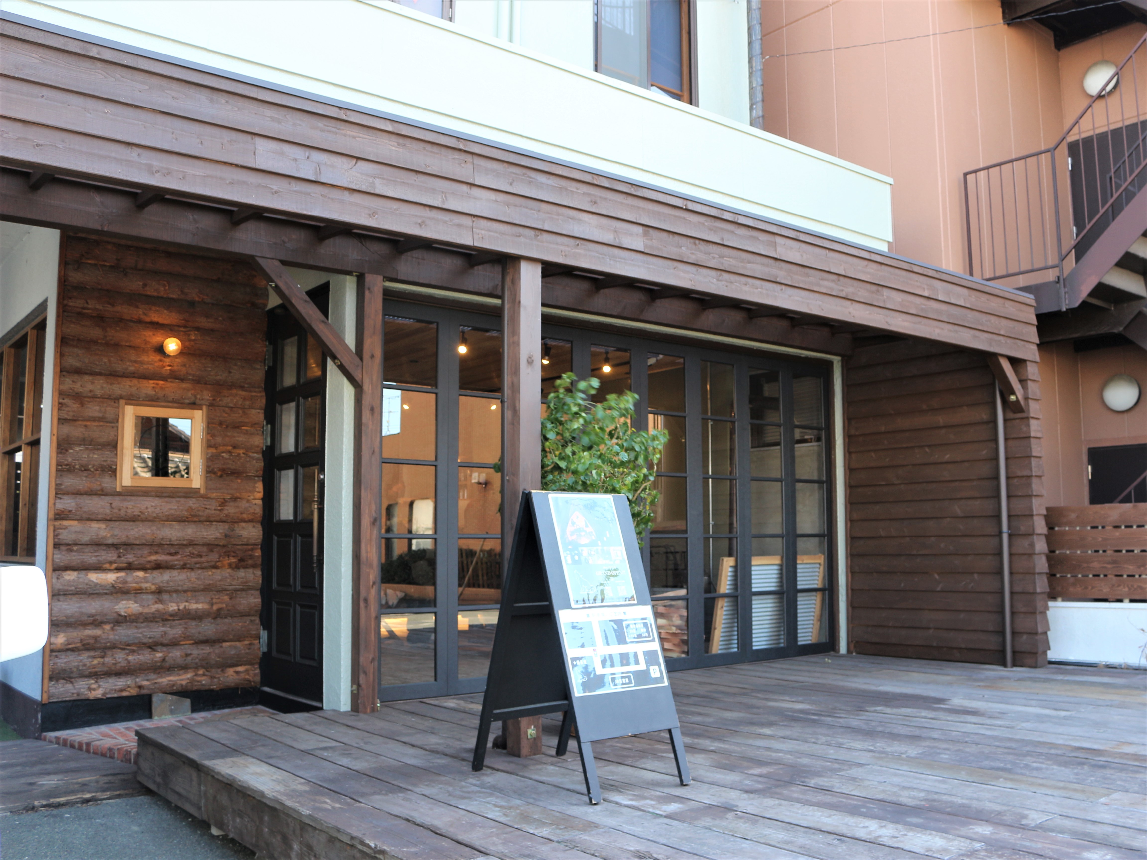 少し歩くとお店が見えてきます。ログハウスのような柔らかい雰囲気でお洒落なお店です。