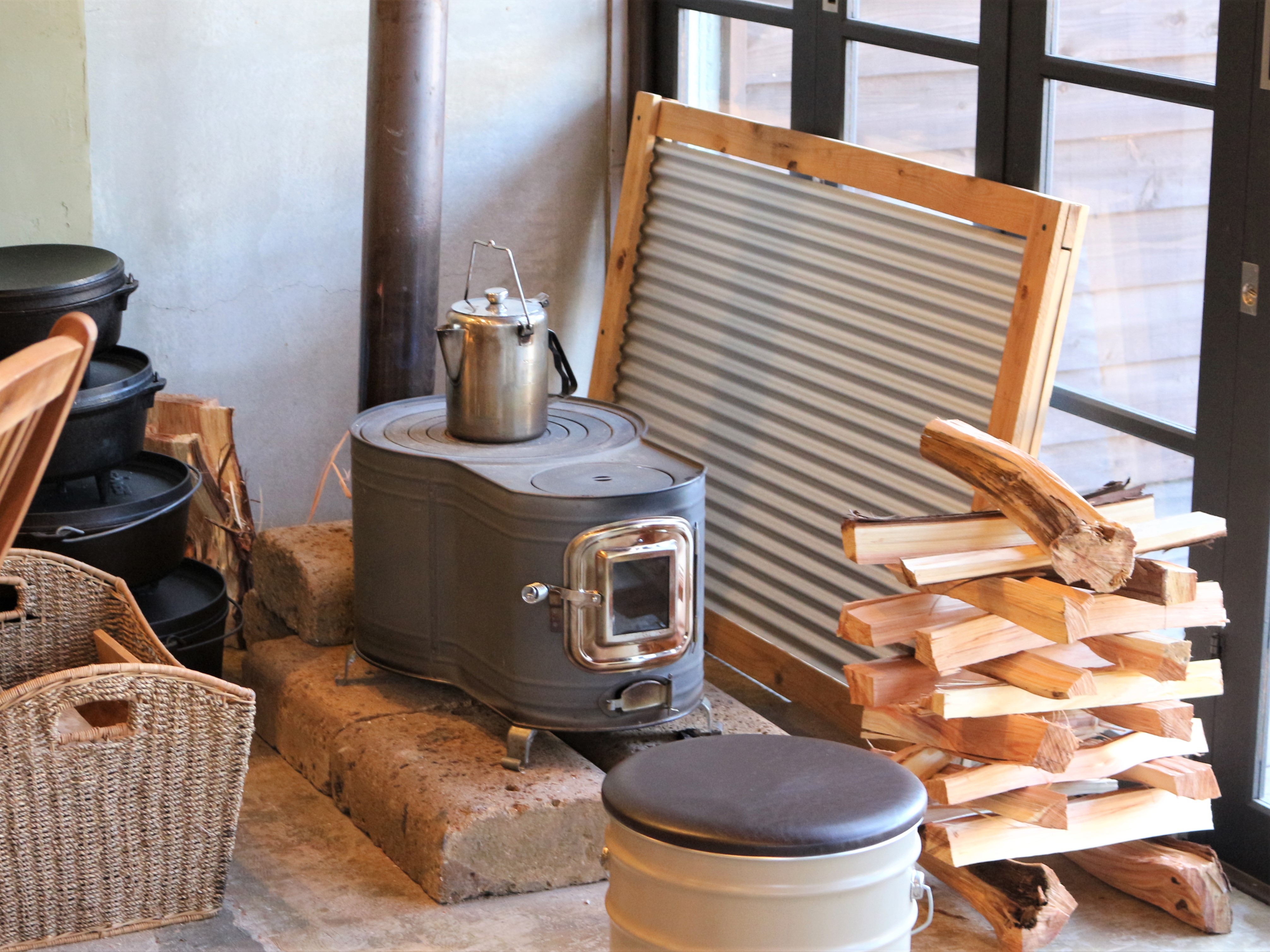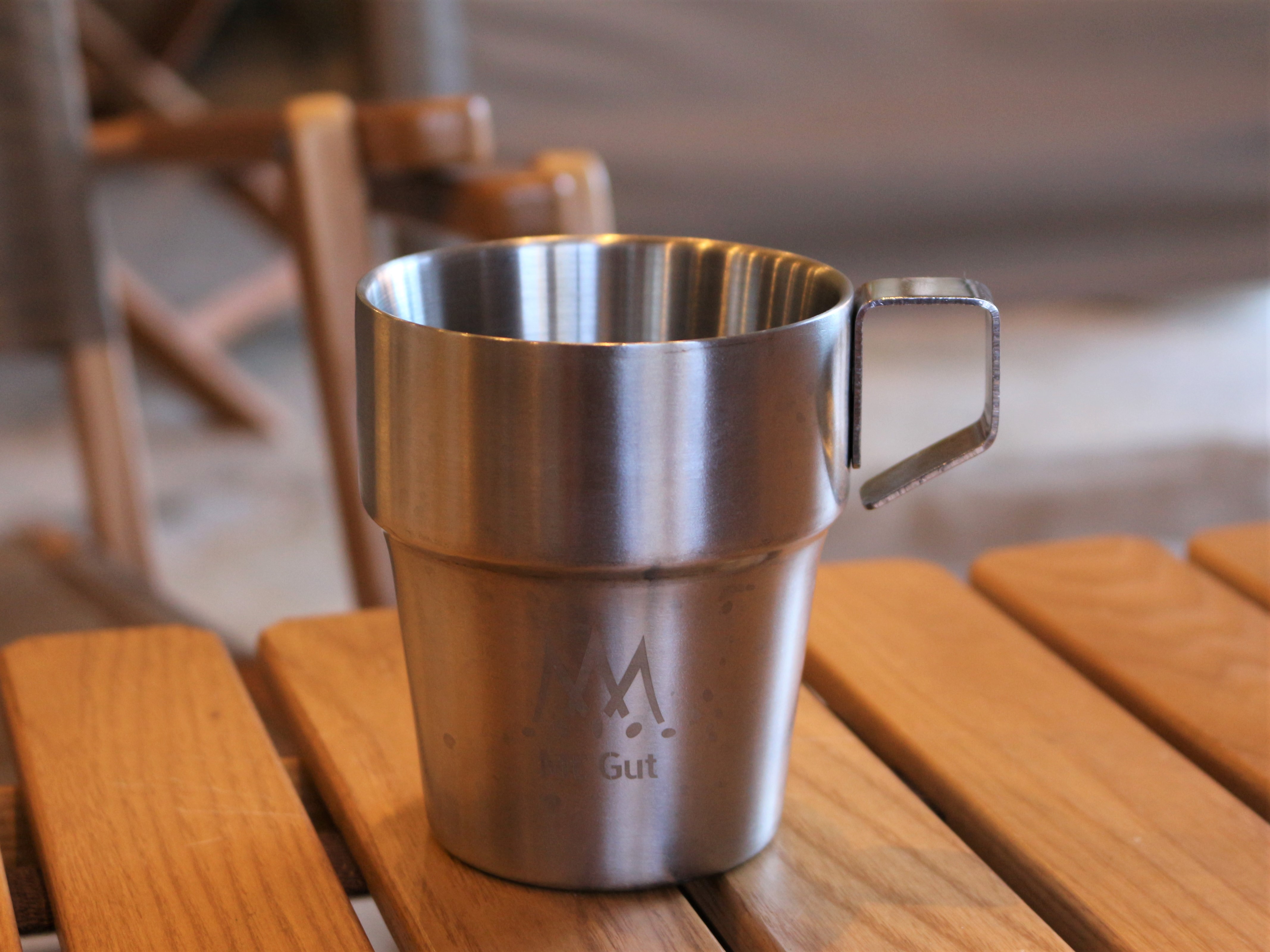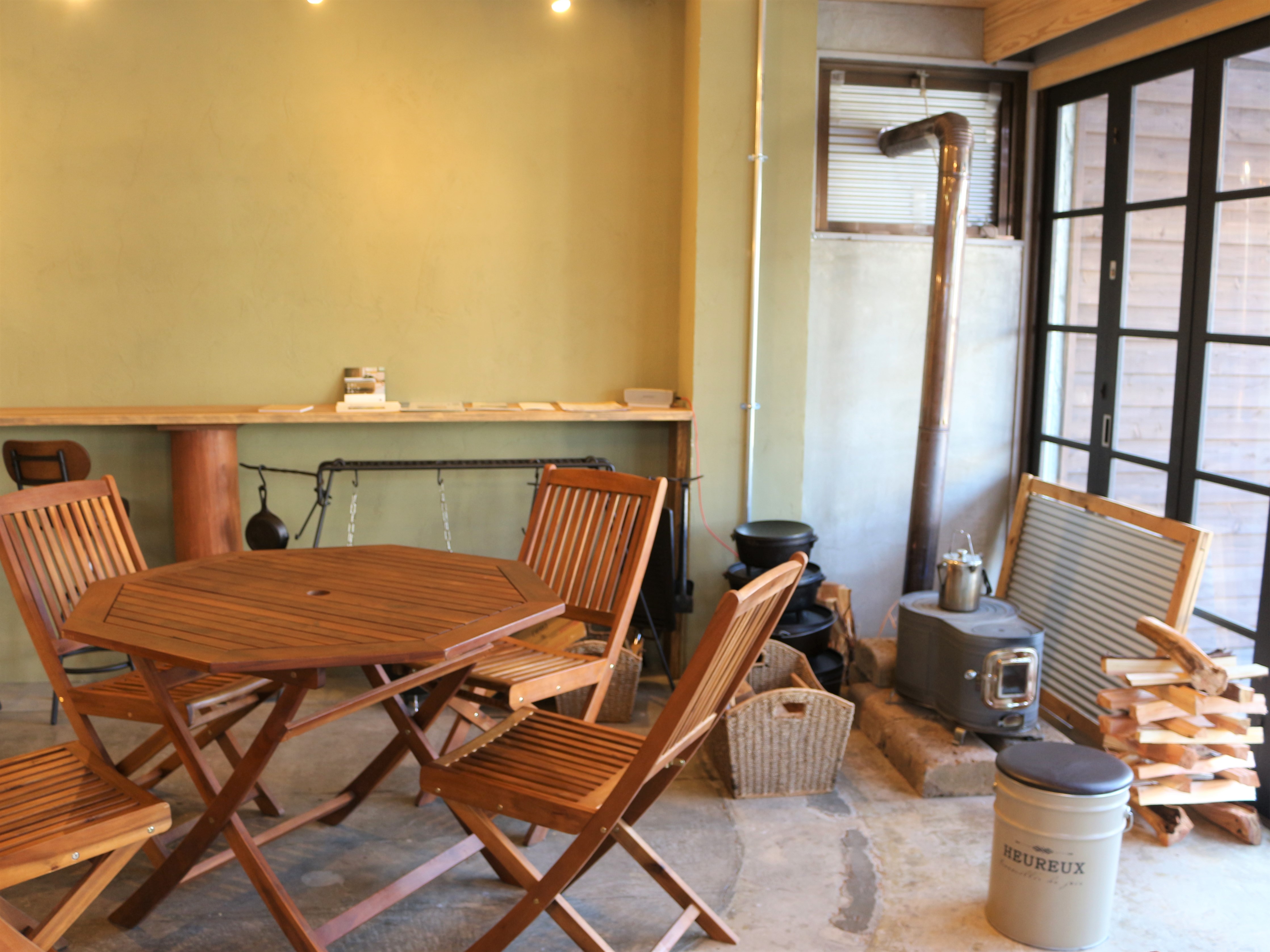 店内には木で作られたテーブルや椅子、アウトドアチェアなど。抜群の雰囲気です。