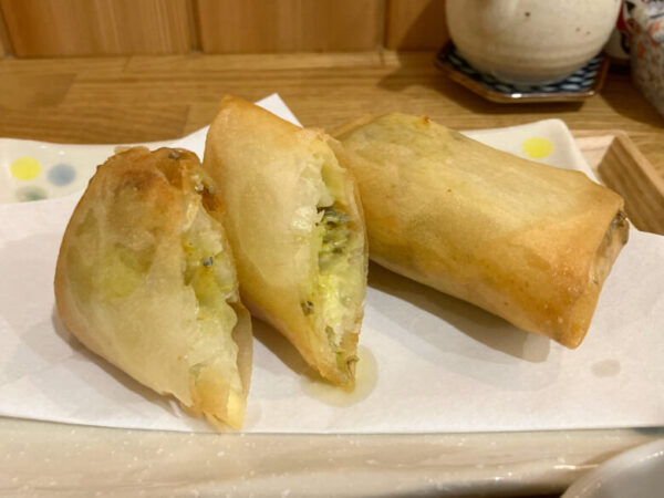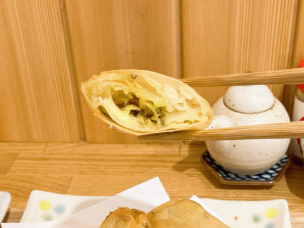 キャベツとじゃこのチーズカレー春巻きは、揚げたてでパリッと軽快な音と共に熱々のキャベツがお目見え。