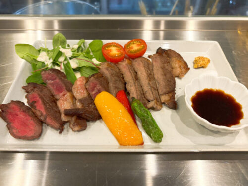 「obanzai」という店名からフードは前菜やおつまみをイメージしていましたが、がっつりメニューも。牛のリブロースを使ったステーキは赤身の中に程よくサシが入っています。