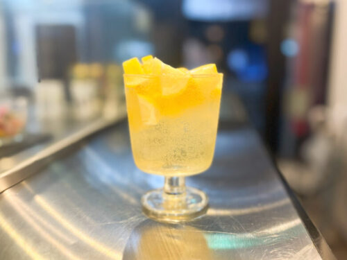 今回いただいたのはバブリーレモンスパークリング。目の前で、たっぷりのフルーツが入ったグラスにスパークリングワインが注がれる演出はつい動画を撮ってしまいたくなります。