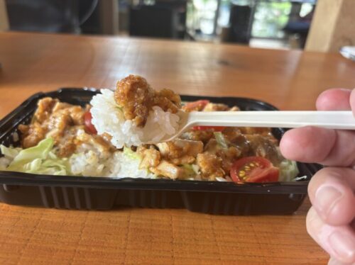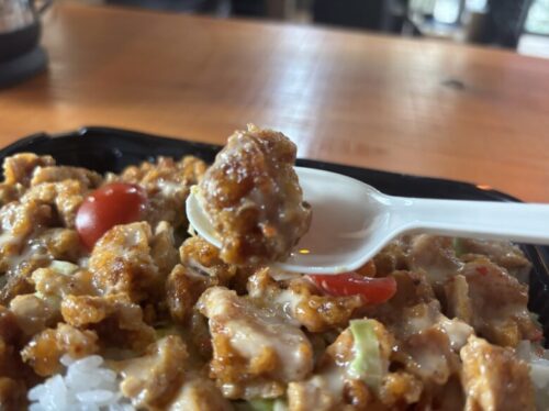 スパイスと特製ドレッシングのようなものが上からかかっており、ご飯に絡んで絶品です。