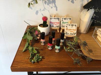 手前のテーブルに置かれているのは、販売目的とは真逆を行く、フリー胡粉ネイル。