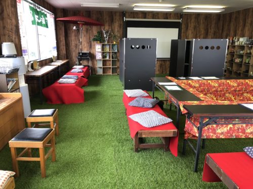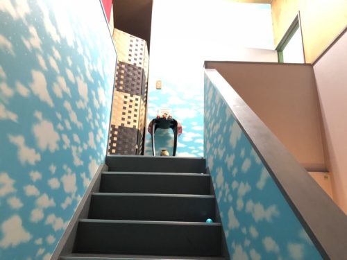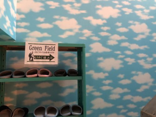 店内中に人工芝が敷き詰められております!裸足で走り回りたい気分。しかし、さっきから気になるのはこの黒い謎のゾーン。