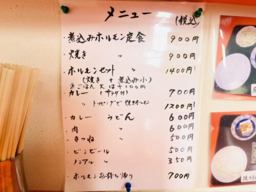 カレーライスや各種うどんもあります。ホルモンはお持ち帰りOKで、焼きホルモンか煮込みホルモンのどちらかを選択できるそうです。